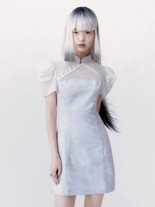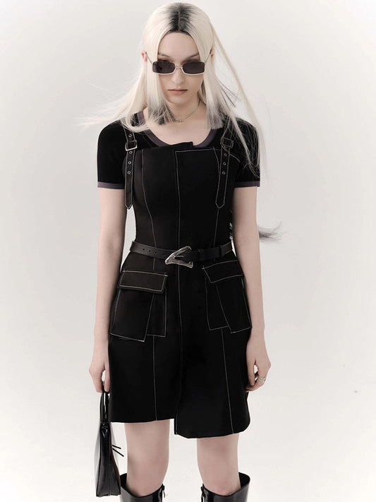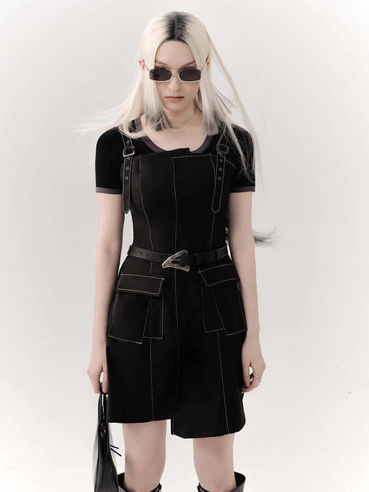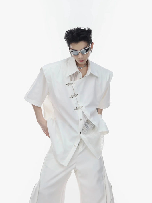 Innovative Asymmetrical Mesh Double-Layer Shirt with Metal Airplane Clasp