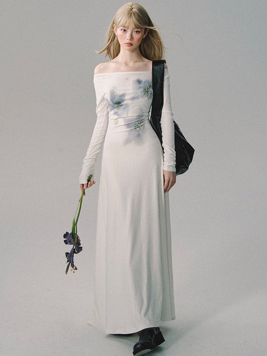 Ink Blooming Print Plus Velvet Elastic One-neck Dress