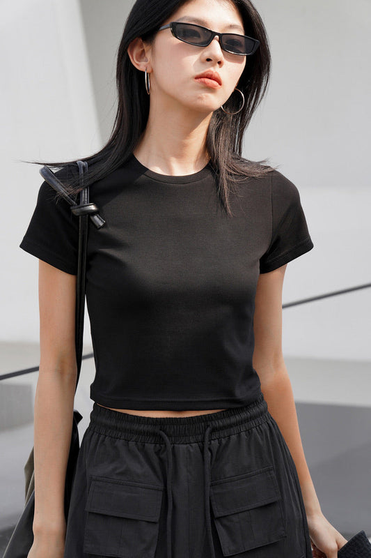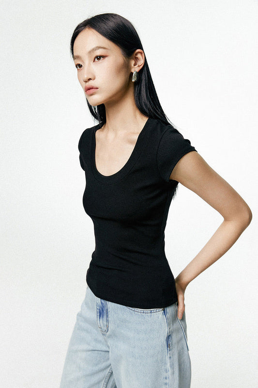 Classic U Neck Cap Sleeve Stretch Tee in Black