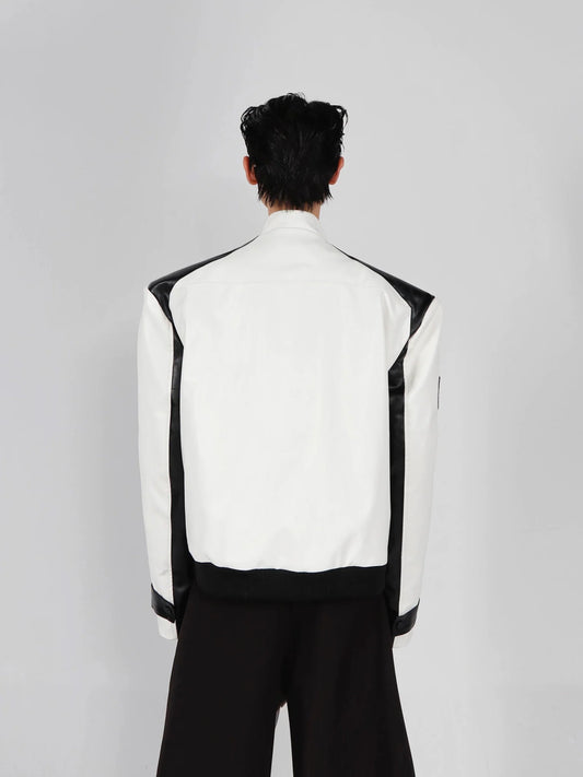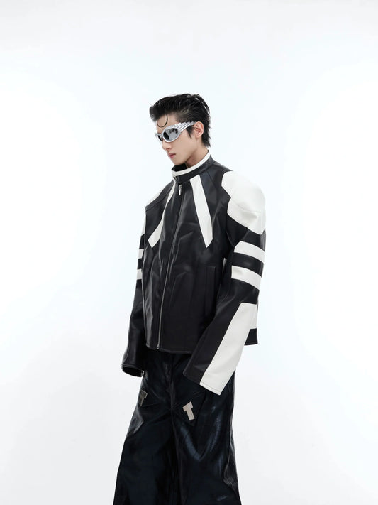 Color-Block Biker Faux Leather Jacket | Padded Shoulder Short Coat