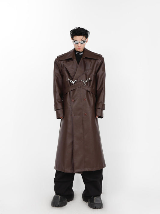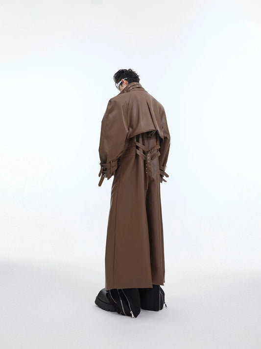 Double-Layered Faux Leather Coat with Metallic Buttons | Over-Knee Trench Coat