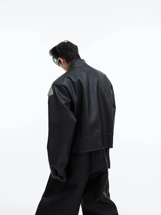 Short Faux Leather Jacket with Metallic Logo | 3D Pattern Coat