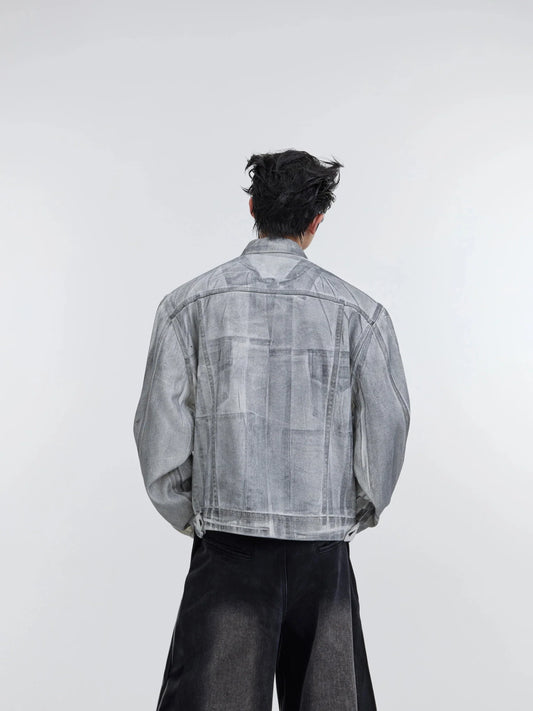Unique Coated Deconstructed Washed Denim Jacket | Short Loose-Fit Coat
