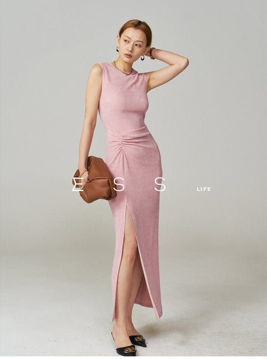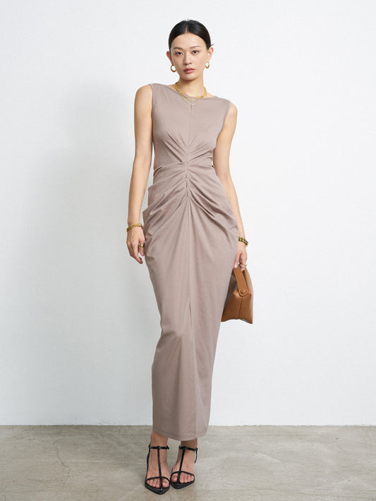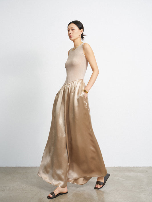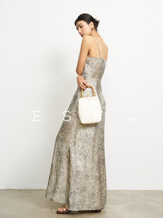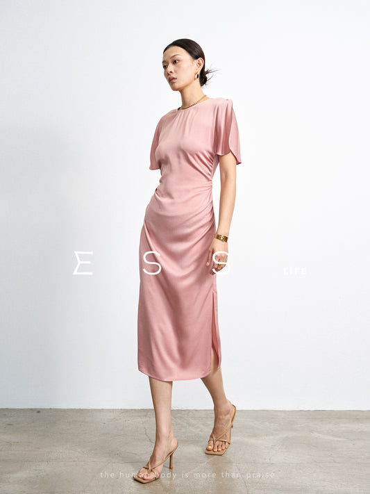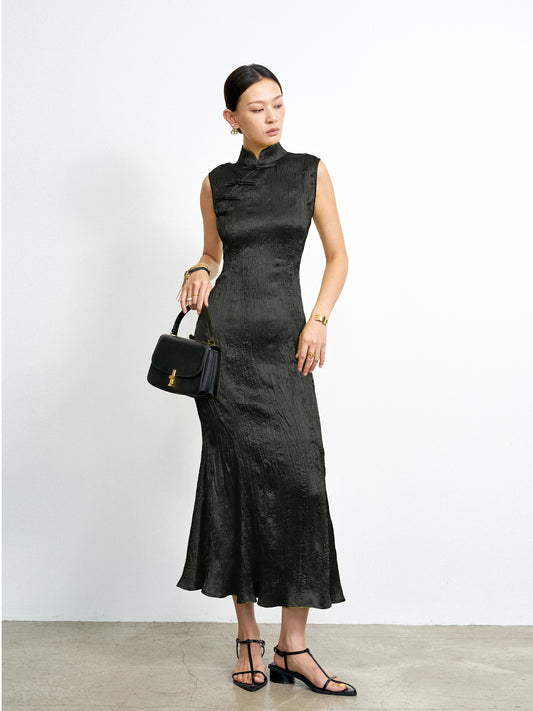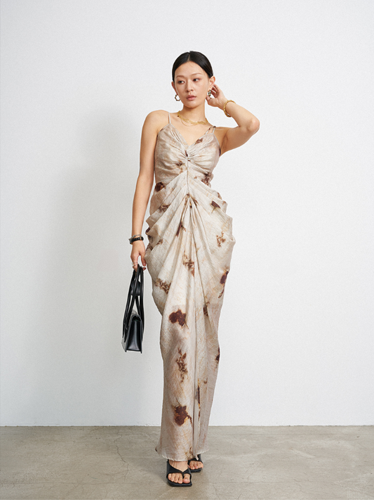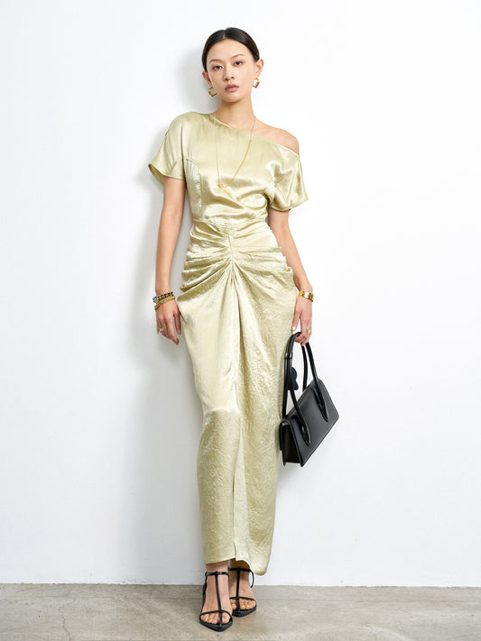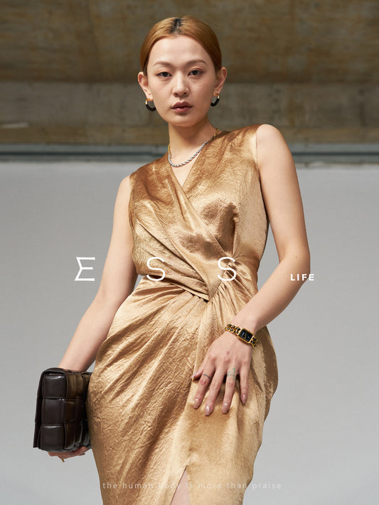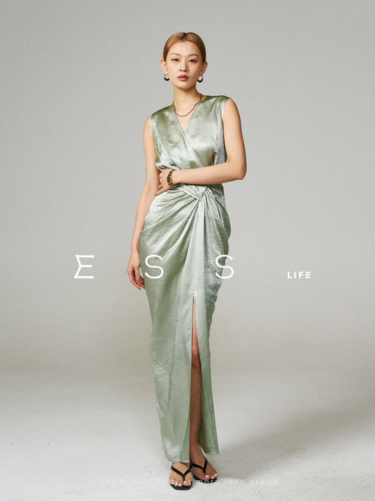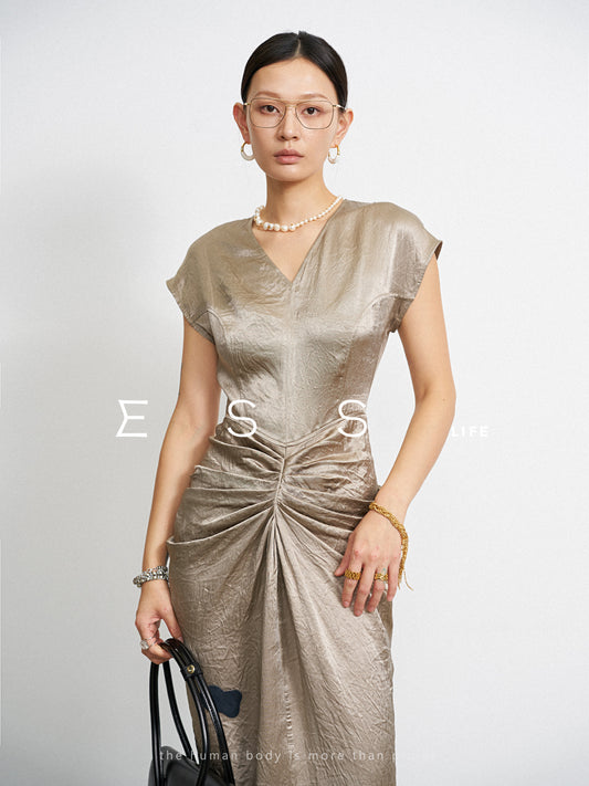 Wrinkled Acetate Satin V-Neck Maxi Dress