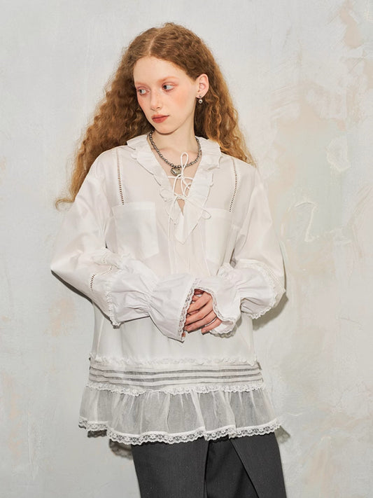 Girly Ruffled V-neck Lace Patchwork Shirt