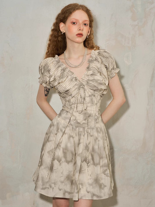 V-neck Wrinkled Girly Puff Sleeve One-piece
