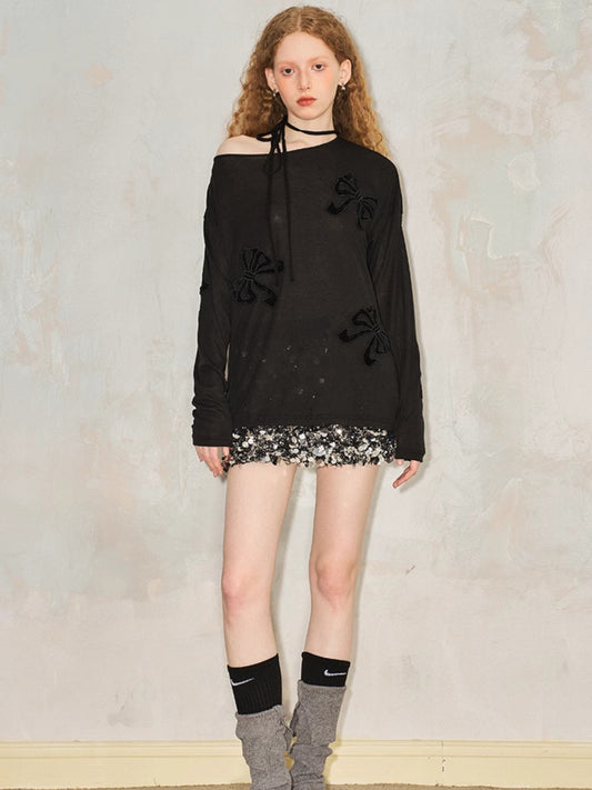 Slant Shoulder Bow Hollow Embroidered Loose Tie Top