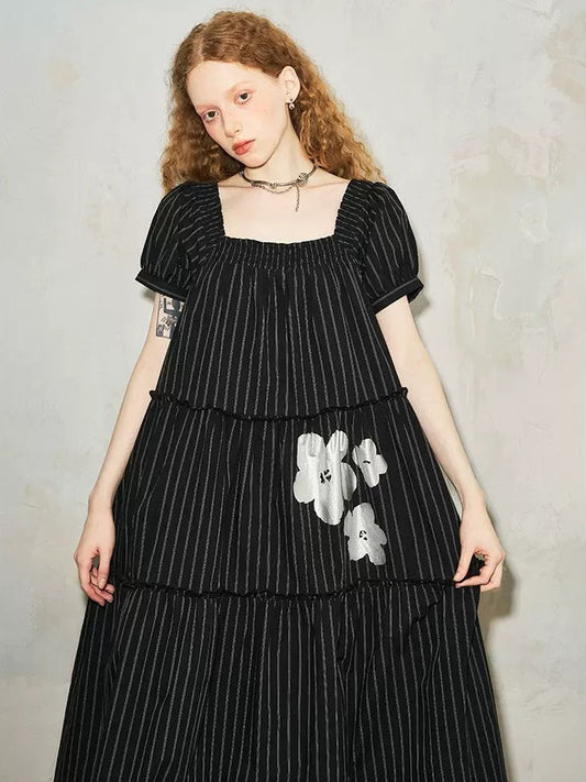 Puff Sleeve Flower Stripe Loose Tiered One-piece