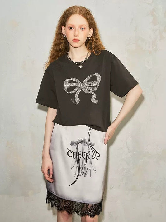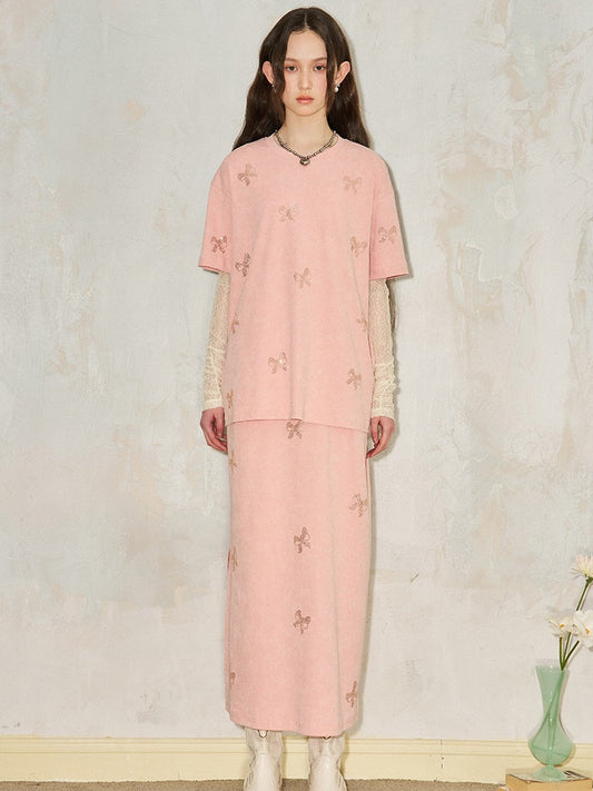 Ribbon Print Round Neck T-Shirt & Fit Slit Long Skirt