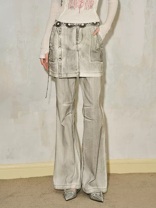 Fake Two-piece Gradation Wash Flared Denim Skirt Pants
