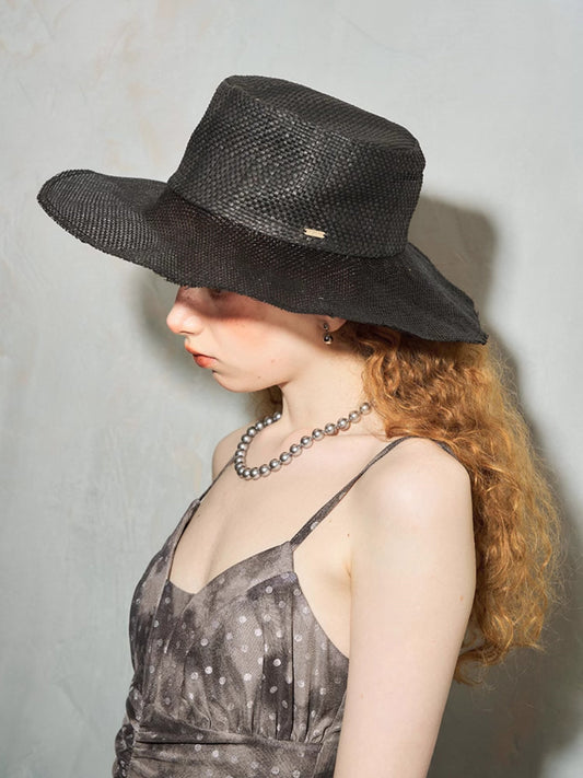 Large Brim Metal Label Woven Hat