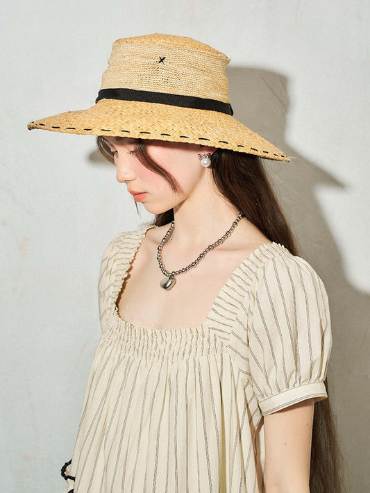 French Style Sunscreen Black Strap Straw Hat