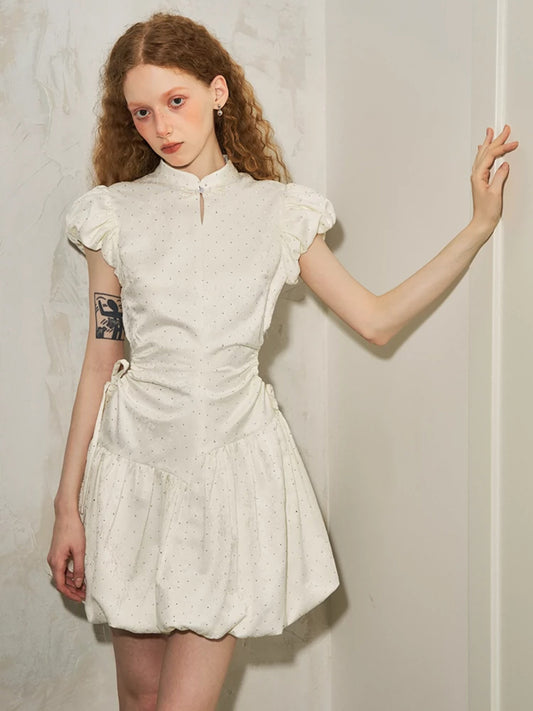 Puff Sleeve Waist Hollowed-out Wrinkled Dress