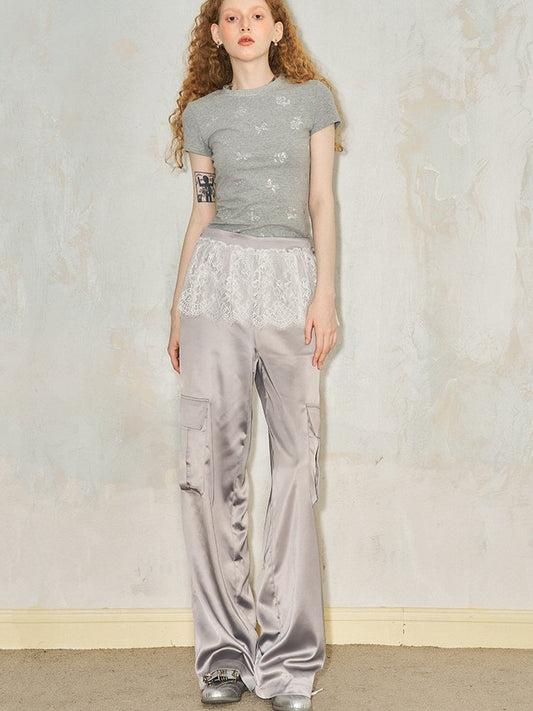 Lace Splicing Straight Loose Shiny Pants