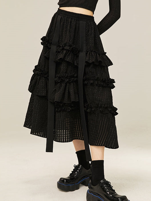 Striped Lace Hollow Long Gather Skirt