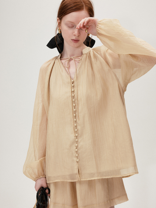 Satin Ruffle V-Neck Lantern Sleeve Blouse