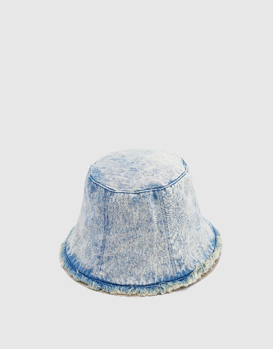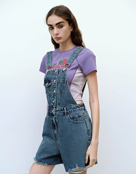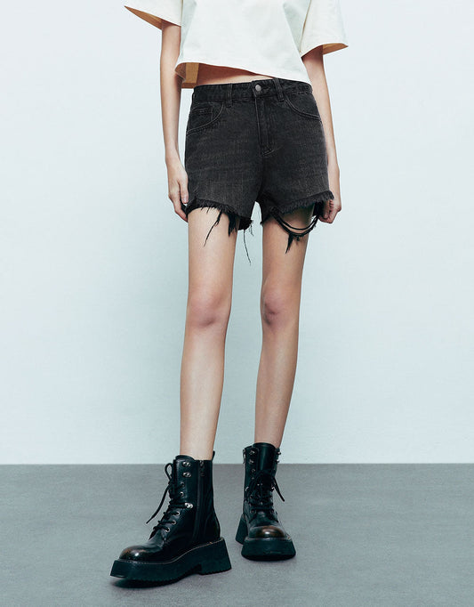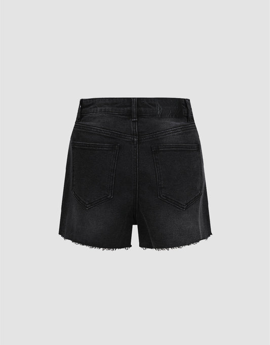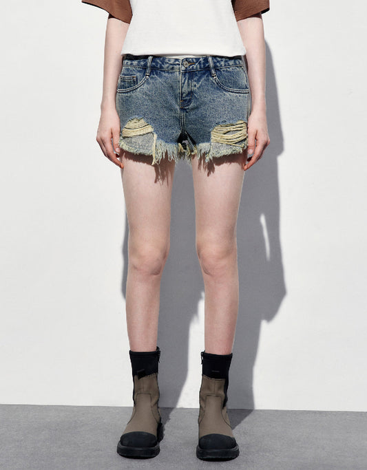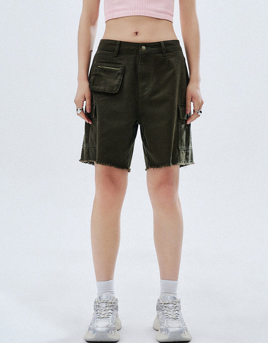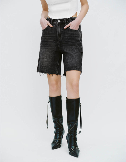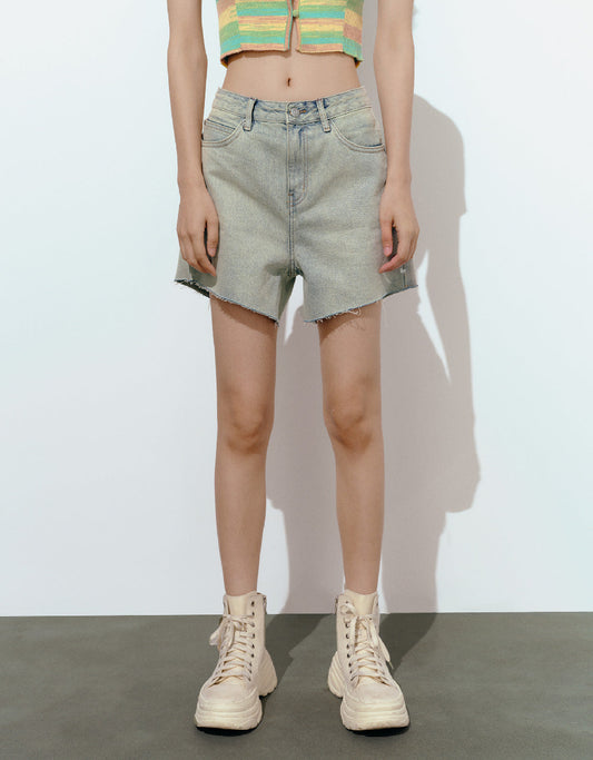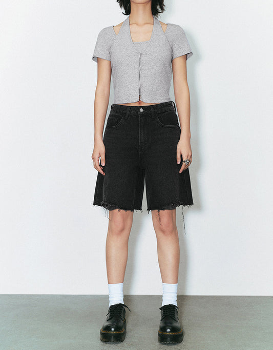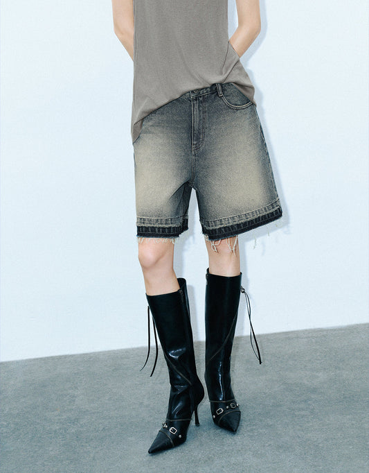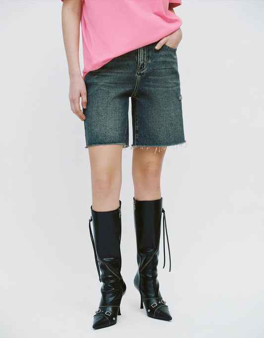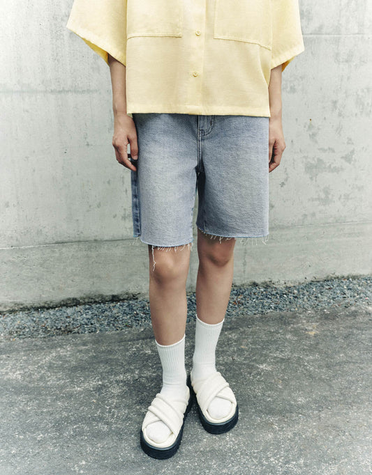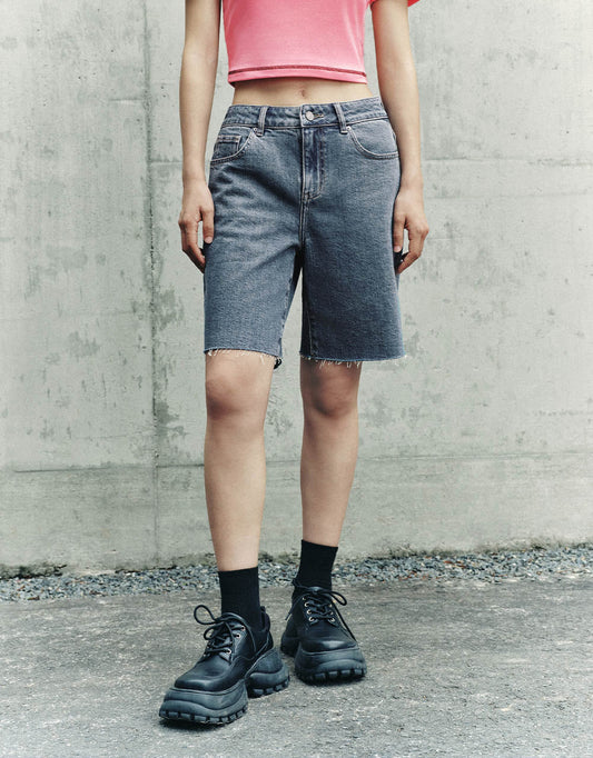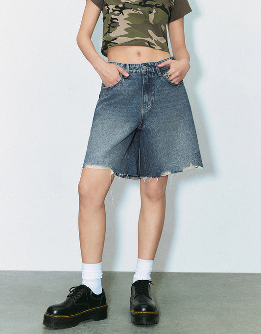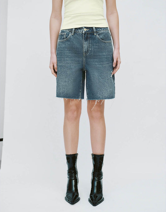 未加工エッジ ミディ デニム ショートパンツ (ブルー)