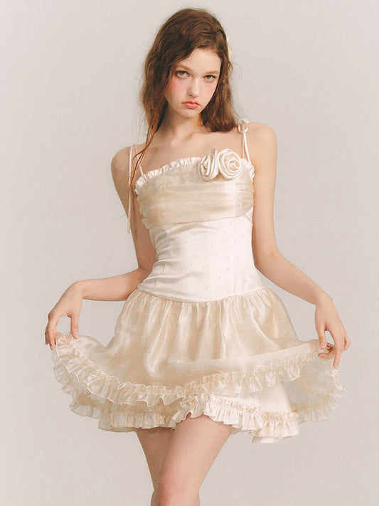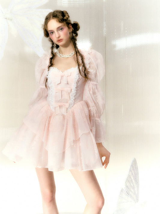 ロマンチックな刺繍入りリボンフラッタースリーブミディドレス