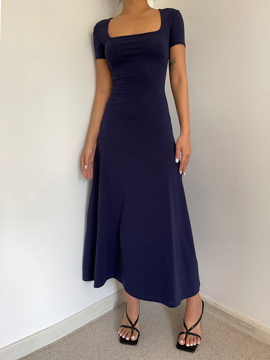 ネイビーの半袖フレアマキシドレス