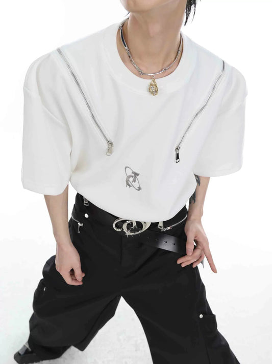 Sleek Metal Zip Short Sleeve Heavyweight T-Shirt with 3D Metallic Print