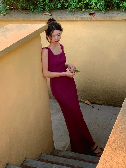 マゼンタのノースリーブスクエアネックマキシドレス