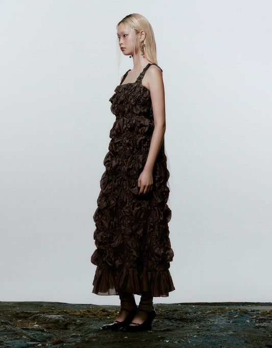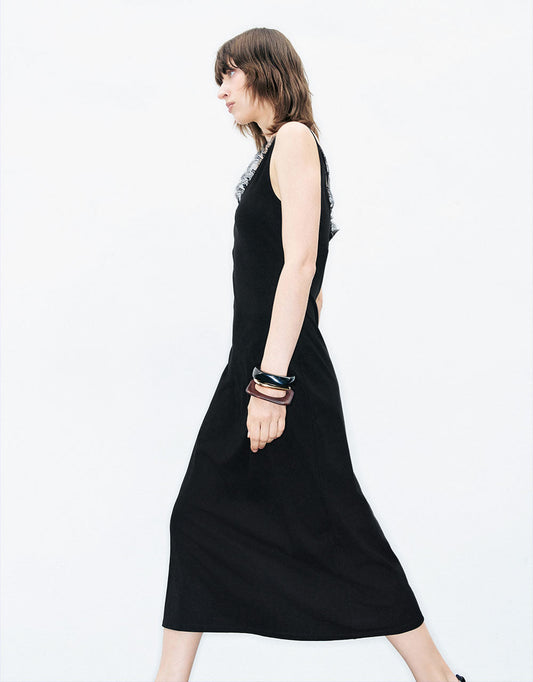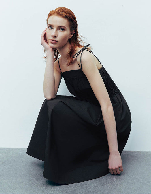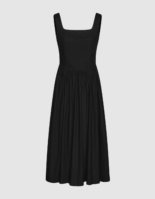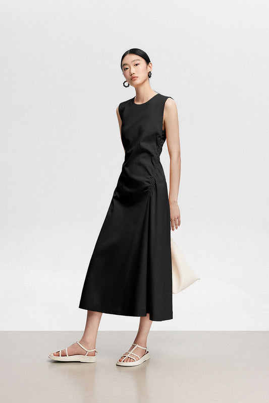 ノースリーブ サイドシャーリング ミディドレス ブラック