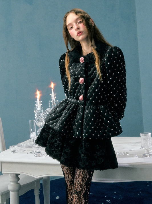 ベルベット刺繍フラワーノーカラーショートコート&スカート