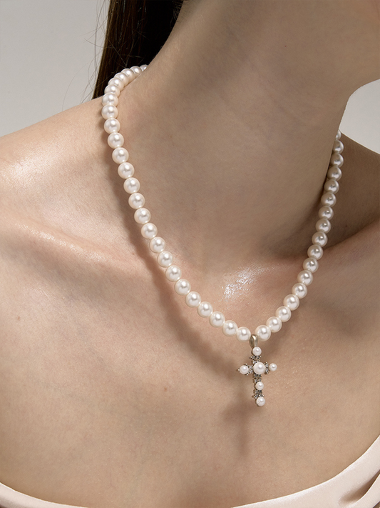 ヴィンテージ バロック パール クロス ネックレス/セーターチェーン