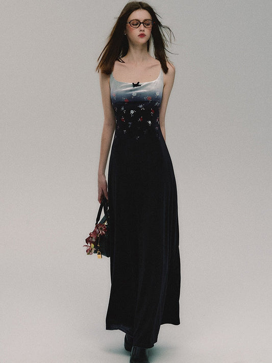 ベルベットプリント Uネック タイ パフスリーブ スリット マキシドレス