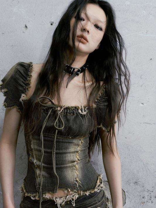 ウォッシュドデニムパフスリーブトップス