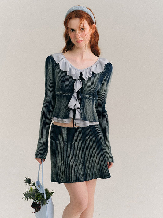 ウォッシュ加工タイダイ編み上げニットカーディガン&スカート