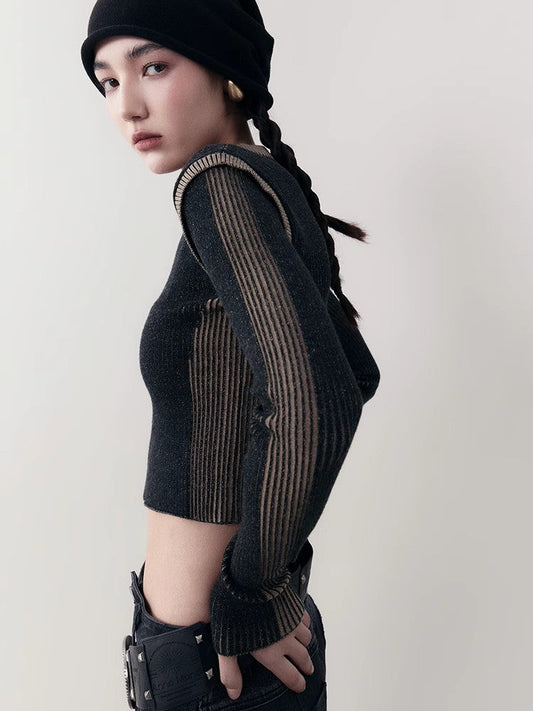 ジップスリムバイカラーシックモデストクルーネックリブニット