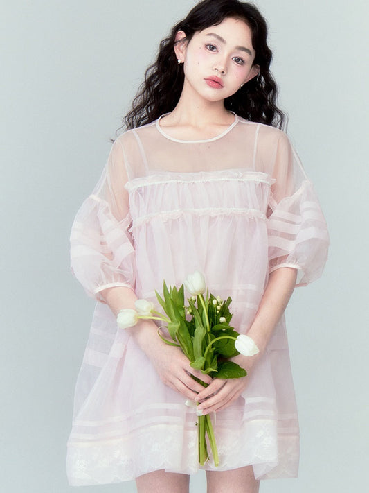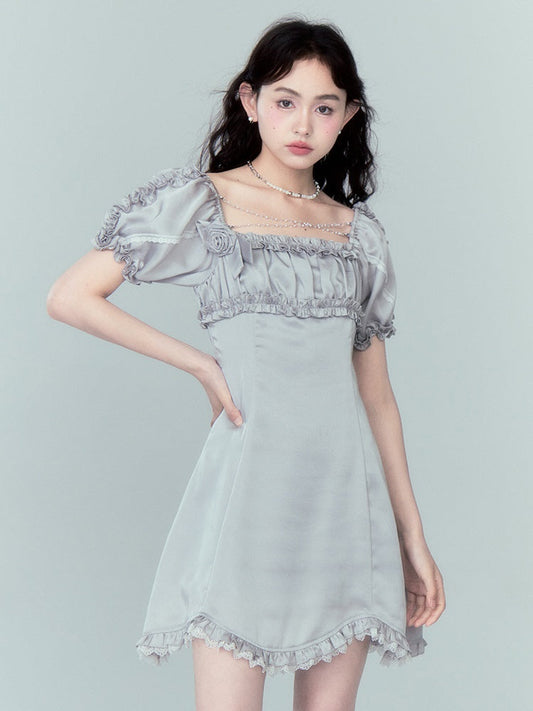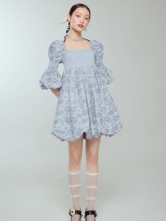 バルーンフラワープリンセスパフスリーブギャザーレトロワンピース