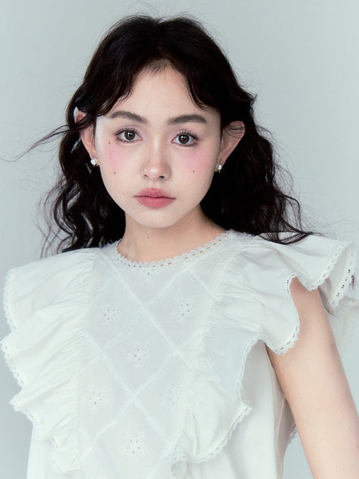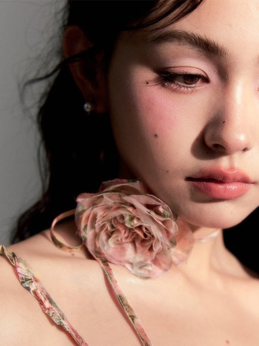 ホルターネックフラワーシワ感フリルシフォンシャツ