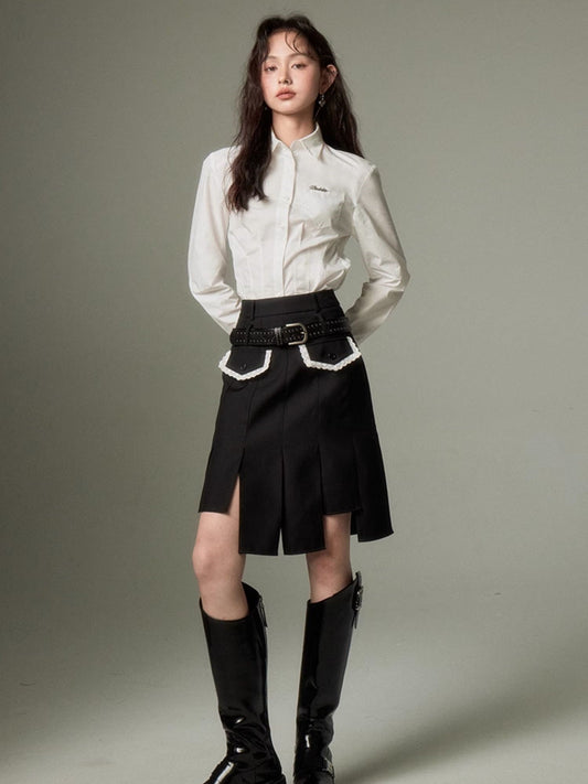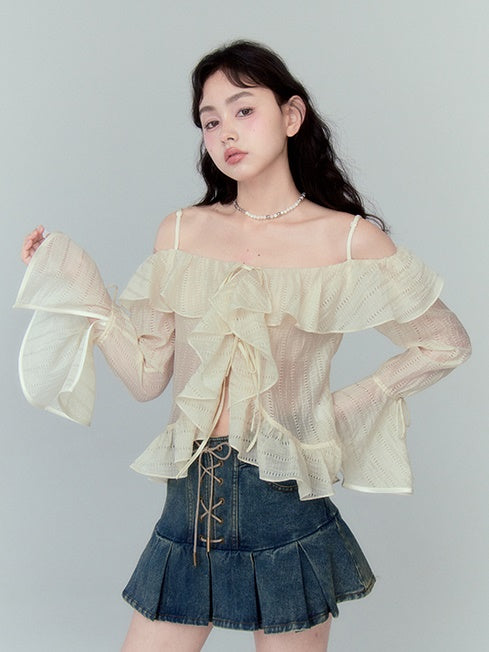 トランペットスリーブ ワンショルダー ロータスリーフ シフォンシャツ