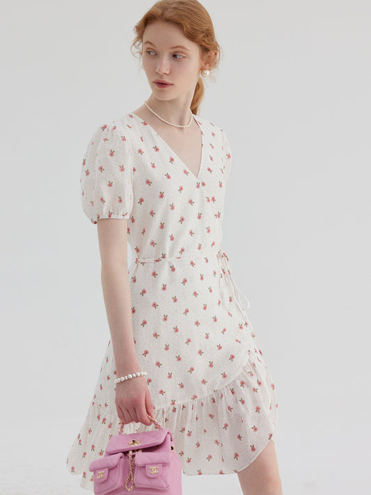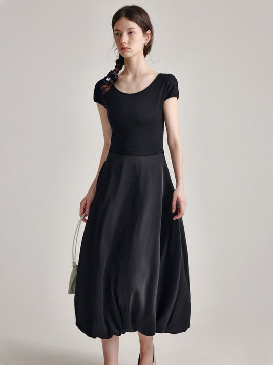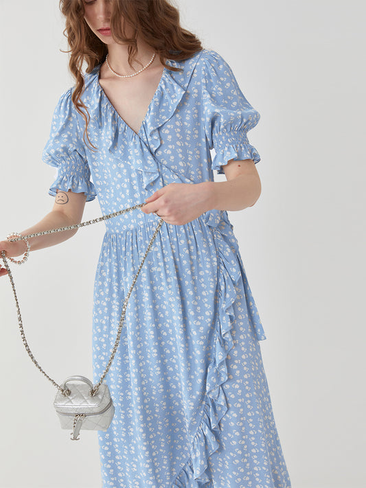 フローラルウエスト絞りバブルスリーブマキシドレス