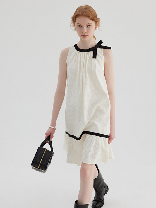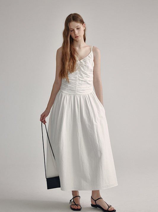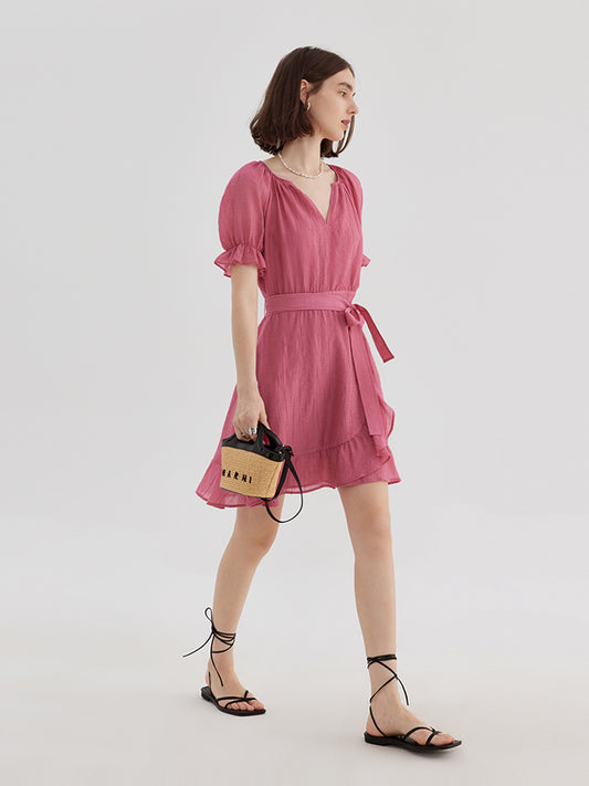 Vネック ルーシュウエスト テクスチャード Aラインドレス