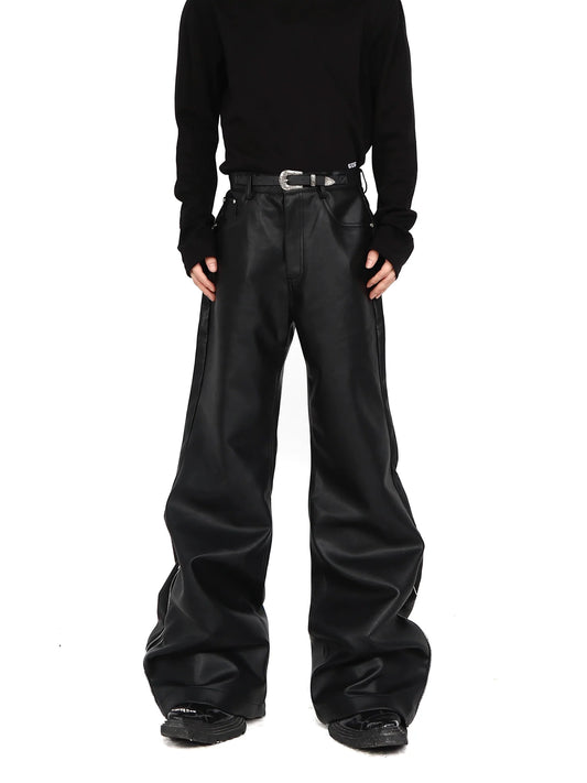 Chic Faux Leather Wide-Leg Pants with Zipper Split and Metal Buckle
