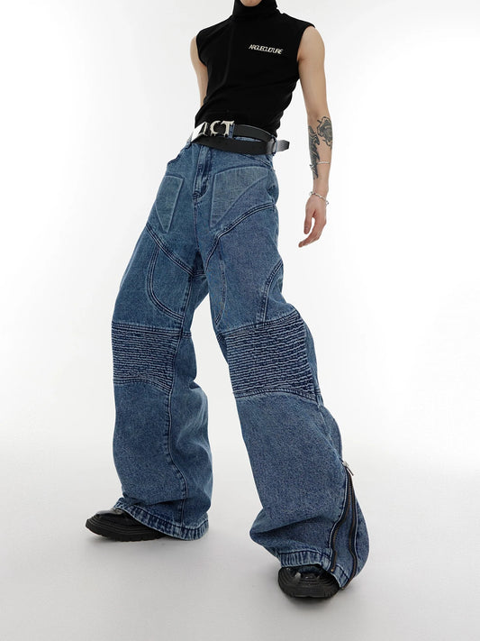 Deconstruct Geometric Washed Pleated Flare Jeans with Zipper Split