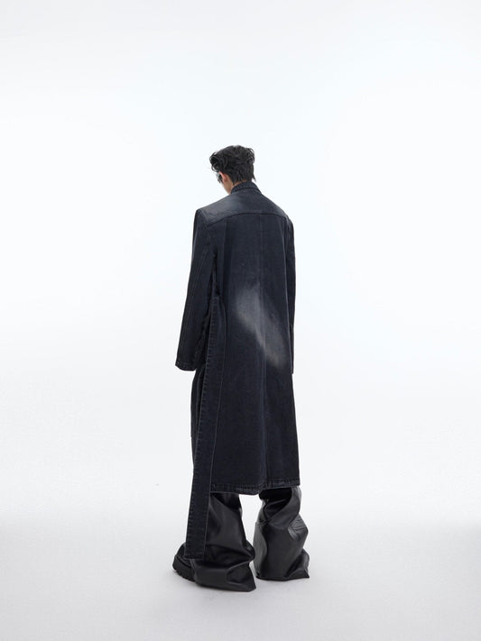 Deconstructed Aged Wash Long Denim Coat | Over-Knee Trench with Line Design