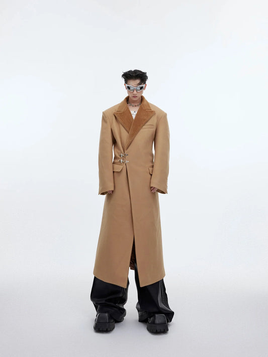 Lamb Wool Designer Overcoat | Metal Buckle Long Woolen Trench Coat