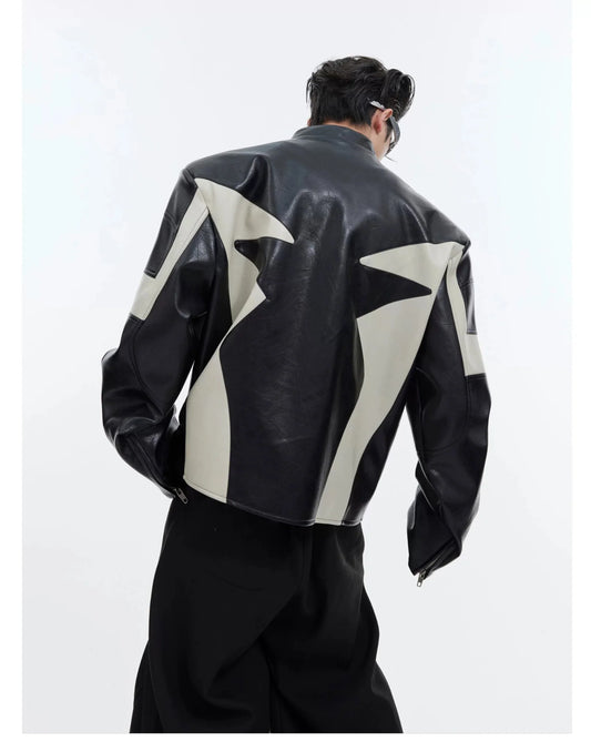 Deconstructed Embossed Design Jacket | Color-Block Short Biker Faux Leather Coat