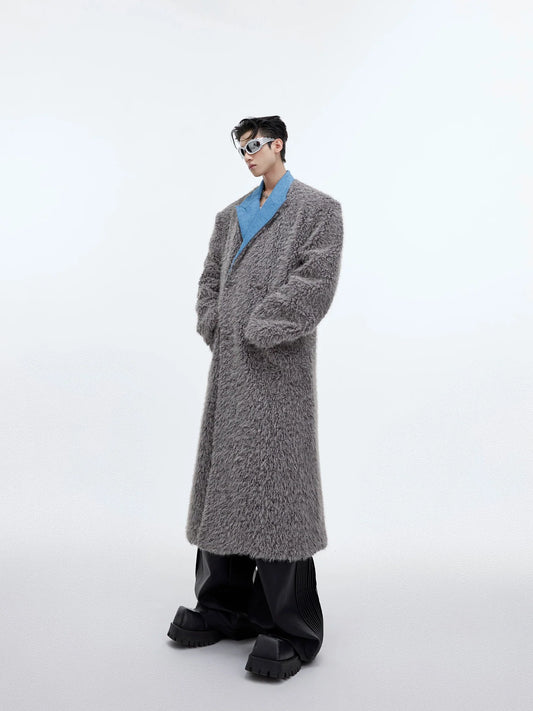 Deconstructed Faux Fur Long Overcoat | Trench Coat with Denim Collar