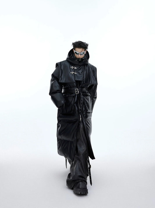 Deconstructed Longline Hooded Puffer | Designer Thick Leather Overcoat