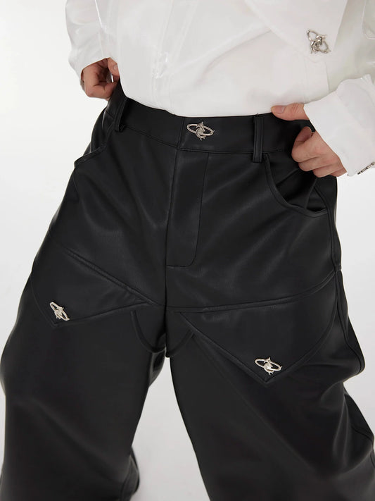 Faux Leather Patchwork Pants with Detachable Airplane Buckle