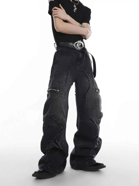 Vintage Distressed Heavy Duty Denim Jeans Wide-Leg Pants
