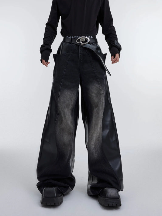 Retro Wash Color-Block Denim Faux Leather Pants | Unisex Wide-Leg