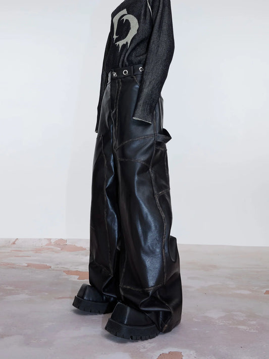 High-Waist Wide-Leg Leather Pants | Patchwork Metal Button Detailing
