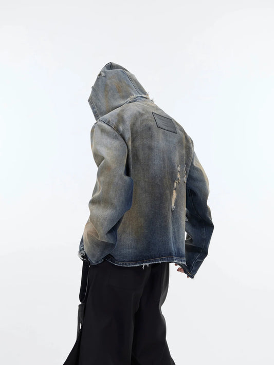 Vintage Distressed Hooded Denim Jacket | Structured Shoulder Destroyed Coat