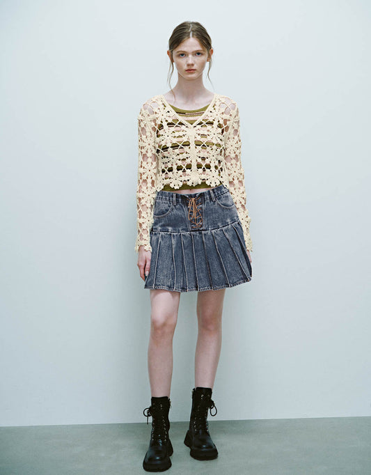 Pleated Lace Up Mini Denim Skirt